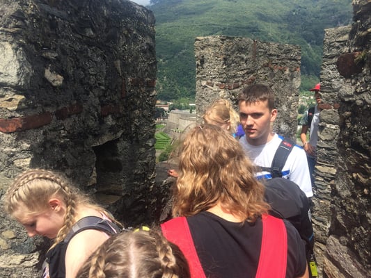 Heute Morgen war wie immer um sieben Uhr Tagwache. Als wir das Zmorge gegessen hatten, erledigten wir die Ämtli und um neun Uhr sind wir mit dem Velo nach Bellinzona gestartet. Als nach einer „Platten“ und einem Sturz alle in Bellinzona ankamen, besuchten wir in zwei Gruppen das Castelgrande und das Castello Montebello. Danach durften wir in Bellinzona zu Mittag essen, wobei leider die meisten Geschäfte wegen einem Feiertag geschlossen hatten. Um halb zwei fuhren wir zu einem Badi-Besuch los. Ganz klar im Zentrum stand der Sprungturm, welcher rege benutzt wurde. Leider begann es um halb drei zu gewittern und alle mussten aus dem Wasser kommen. Als wir zurück nach Grono fuhren, wurden wir durch den Regen noch mehr nass. In Grono deponierten wir die Velos in einer Halle und mussten auf das Postauto warten - wir hatten Zeit noch ein bisschen in Grono (mit geöffnetem Denner) zu sein. Eine kleine Gruppe mit sechs SchülerInnen liess sich vom Regen und von der steilen Strasse nicht abschrecken und fuhr mit den Velos die 12km und 700 Höhenmeter ins Lagerhaus: Bravo! Nach dem Abendessen hatten wir Freizeit und nach einer feinen Glacé fielen wir in unser Bett.